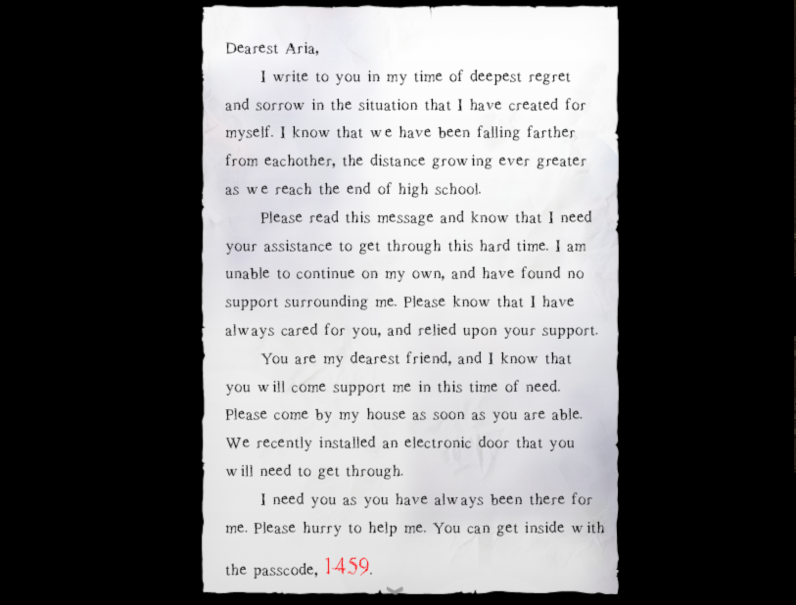 Aria is close to graduating high school, and often wonders about how her friend Emma is doing. They grew up together and have been friends for a long time, but lately, that has changed. Emma has become more distant, disconnected, and pushes further into a state of self-isolation. Aria does not know what to do and leaves her friend to grow on her own. The truth of the matter is that Emma no longer is interested in what “normal” people want to do, and how they want to progress their lives. Emma is bored and see’s no point in trying to do anything past high school. Her parents have enough money for her to just live at home, and are hardly ever home as is going on business trips. Emma is close to giving up on everything when a friend, Cory, mentions to her that he has a book that he believes would help her as it helped him move past similar issues. Strangely Cory disappears after giving the book to Emma, though Emma is unable to read the book at first because it appears to be written in a different language. Eventually Emma can read the book, as it seems to whisper and speak to her to allow her to understand its secrets. The book wants to be used, and needs Emma to follow its guidance to help it achieve its goals. This does not end well for Emma however, and she finds that she is in desperate need of assistance from someone to help save her. Emma manages to get a letter out to Aria, requesting that she come to her aid. Aria, still caring about Emma, arrives at Emma’s house to help her, and must figure out what happened within Emma’s house to not only save her friend, but to also escape from the new world the house has turned into.
